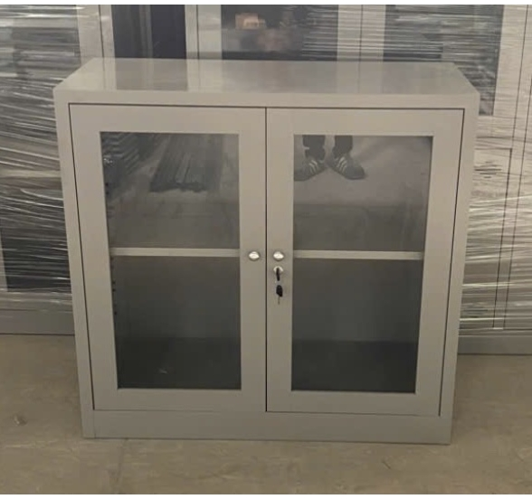 Tủ sắt hồ sơ thấp 2 cánh mở được sơn tĩnh điện thiết kế một khoang chia hai ngăn, cửa kính trong suốt, lưu trữ đồ dùng nhỏ gọn vừa trưng bày vừa bảo quản hồ sơ, tài liệu hoặc vật phẩm mẫu cho văn phòng.